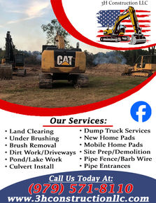 3H Construction specializes in many different aspects of dirt work from residential to commercial farm and ranch clearing services in Grimes, and surrounding Counties as well as a wide variety of other construction of ponds/lakes, land clearing, pad sites, culverts and driveways, 3H Construction has 30 of experience with working on land clearing, Ranch and Farm services of all kinds.