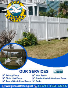 Gulf Coast Fencing is a full service fence building company locally owned and operated in the Rockport TX area. We have been serving Rockport, Aransas Pass, Port Aransas, Portland and other surrounding communities for the past 17 years. We are a member of the Rockport-Fulton Chamber of Commerce, as well as the BBB of Texas, with a A+ rating. Our services include privacy fencing, chain link fencing, ranch wire & panel fencing, vinyl fencing, and powder coated aluminum fencing which comes in a variety of colors.