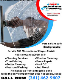 Jones Window Cleaning Service is a locally veteran-owned and operated business in Corpus Christi. We do everything from window cleaning, fence painting, haul-off, pressure washing, and more! We know your house is clean, how about your windows???